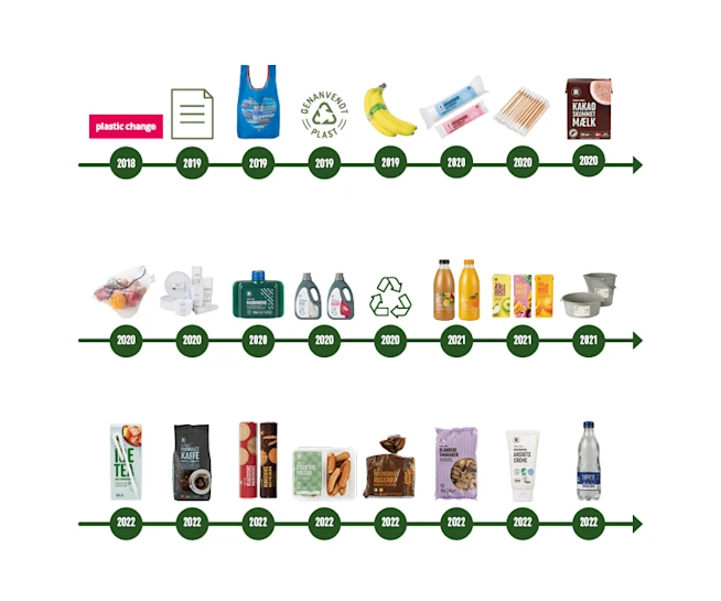 På tidslinjen kan du se, hvilket tiltag vi har gjort de senere år for at reducere brugen af plast.